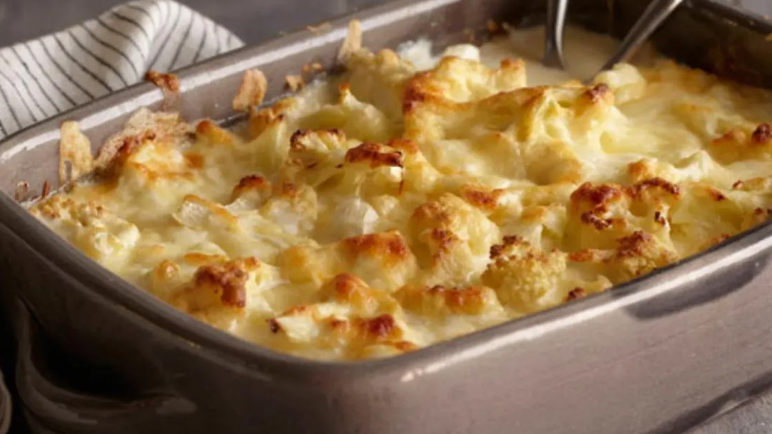 - Layer the cauliflower, heavy cream and all three cheeses in a medium casserole dish. Season with salt and pepper. Roast for 30 minutes or until the cauliflower is soft and the sauce has thickened slightly. Remove from the oven and let stand 10 minutes before serving.