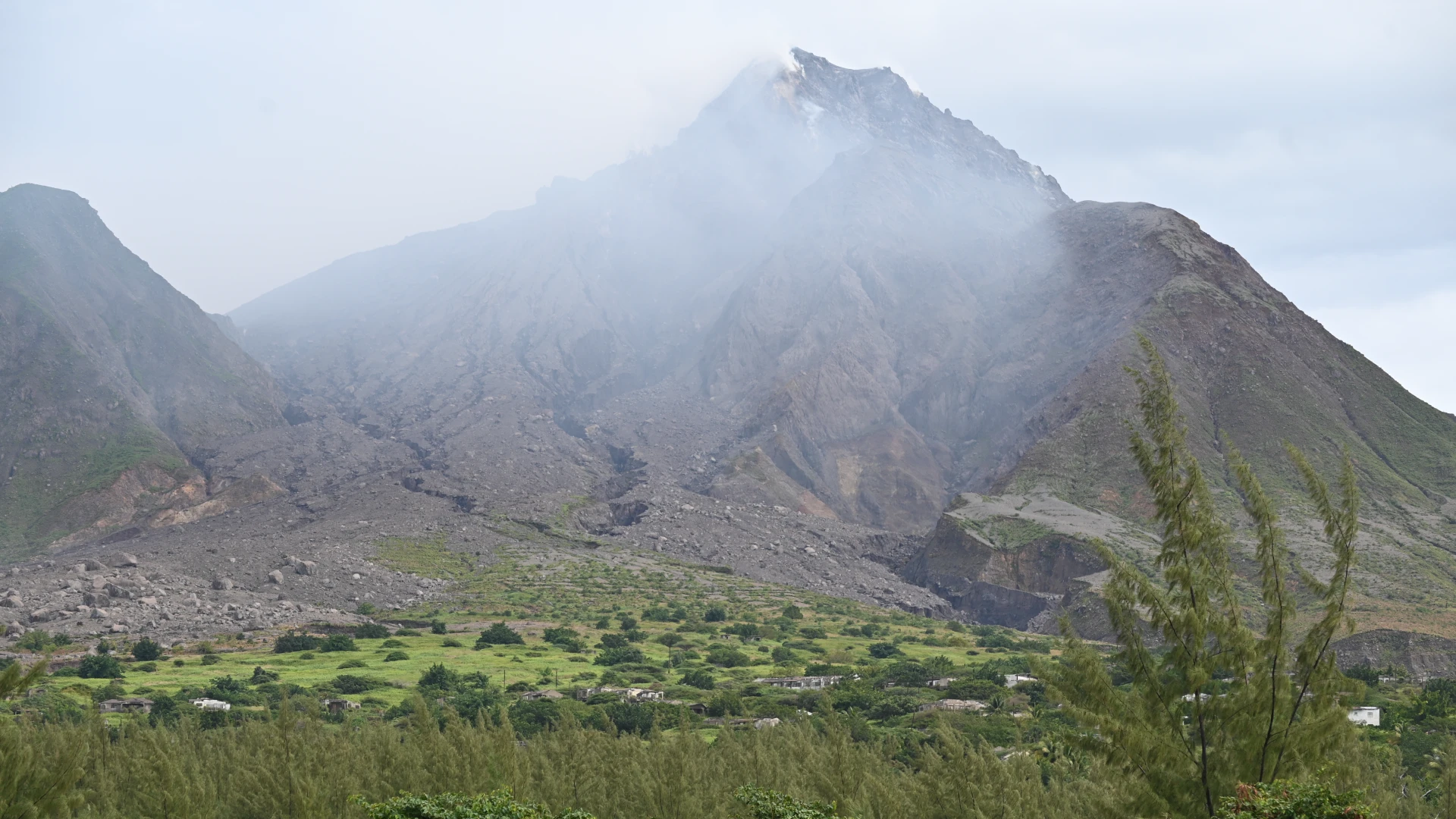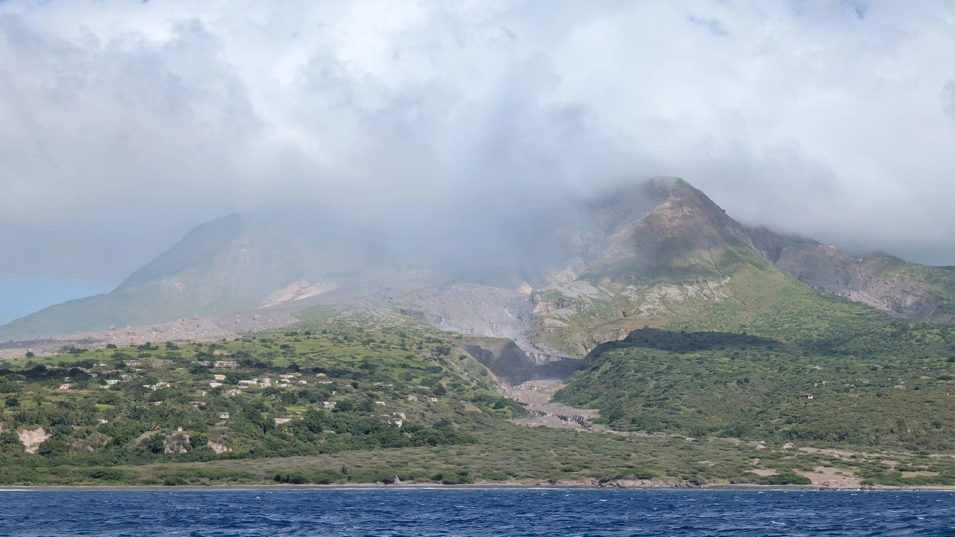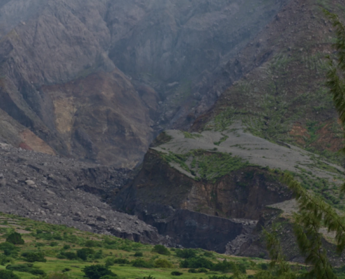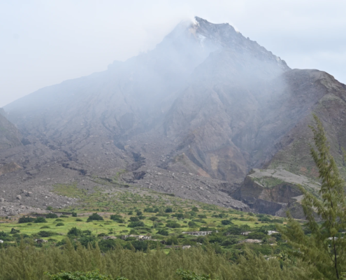 Soufrière Hills and Plymouth below (16.703996 , -62.221992)