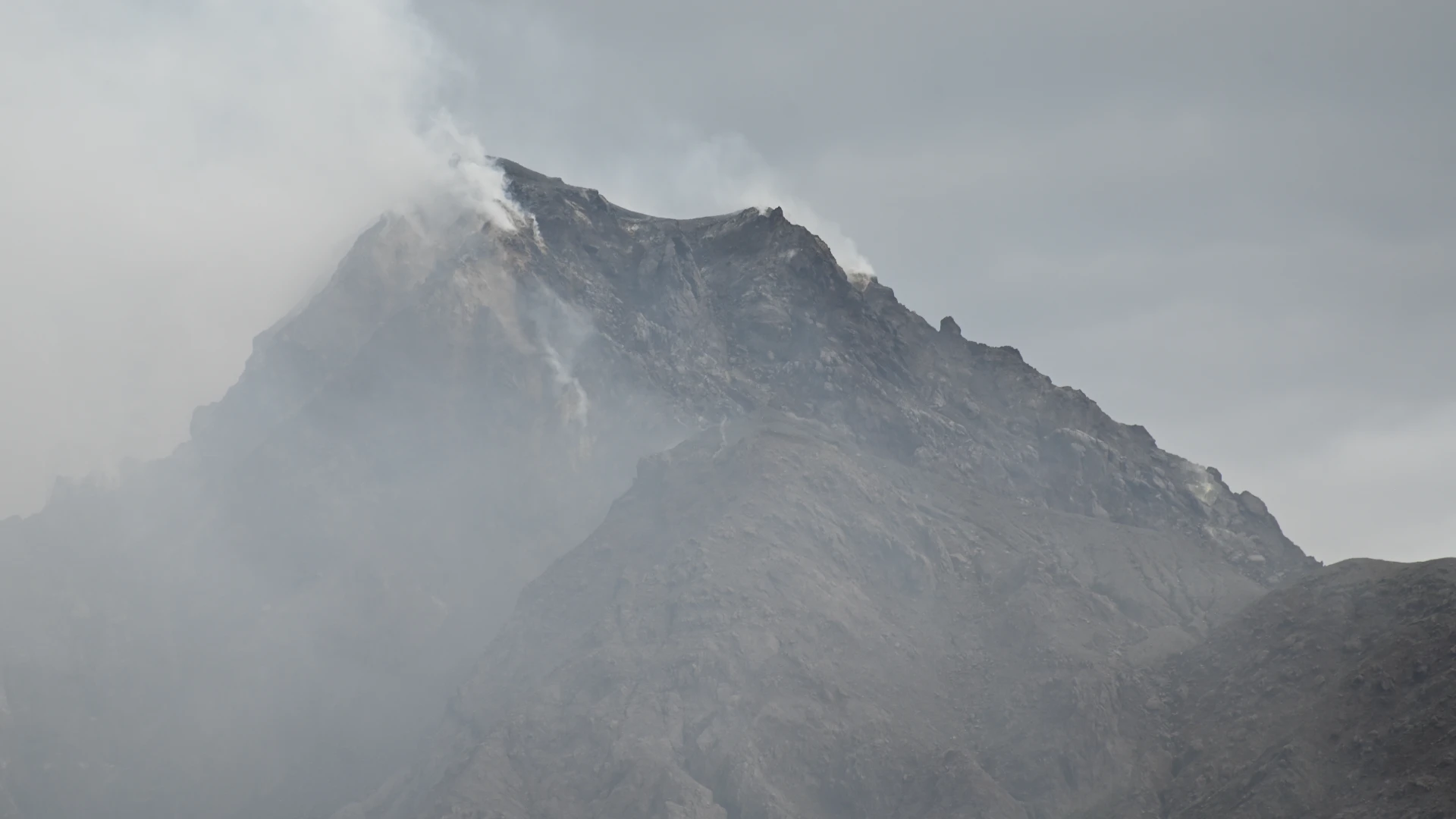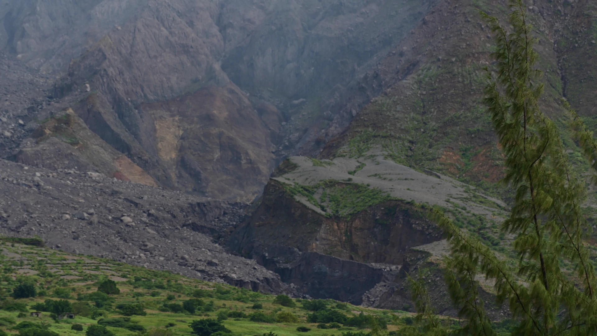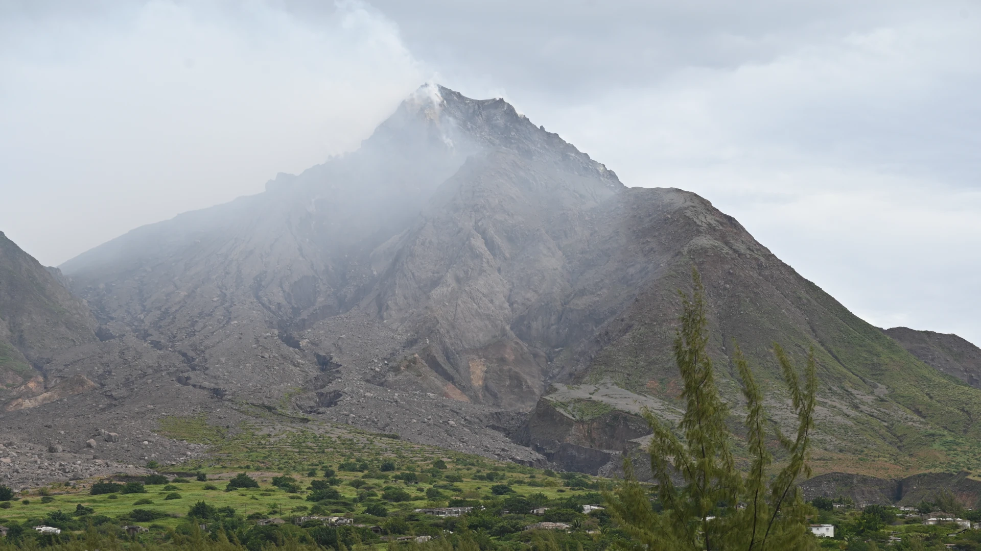 Soufrière Hills and Plymouth below (16.703996 , -62.221992)