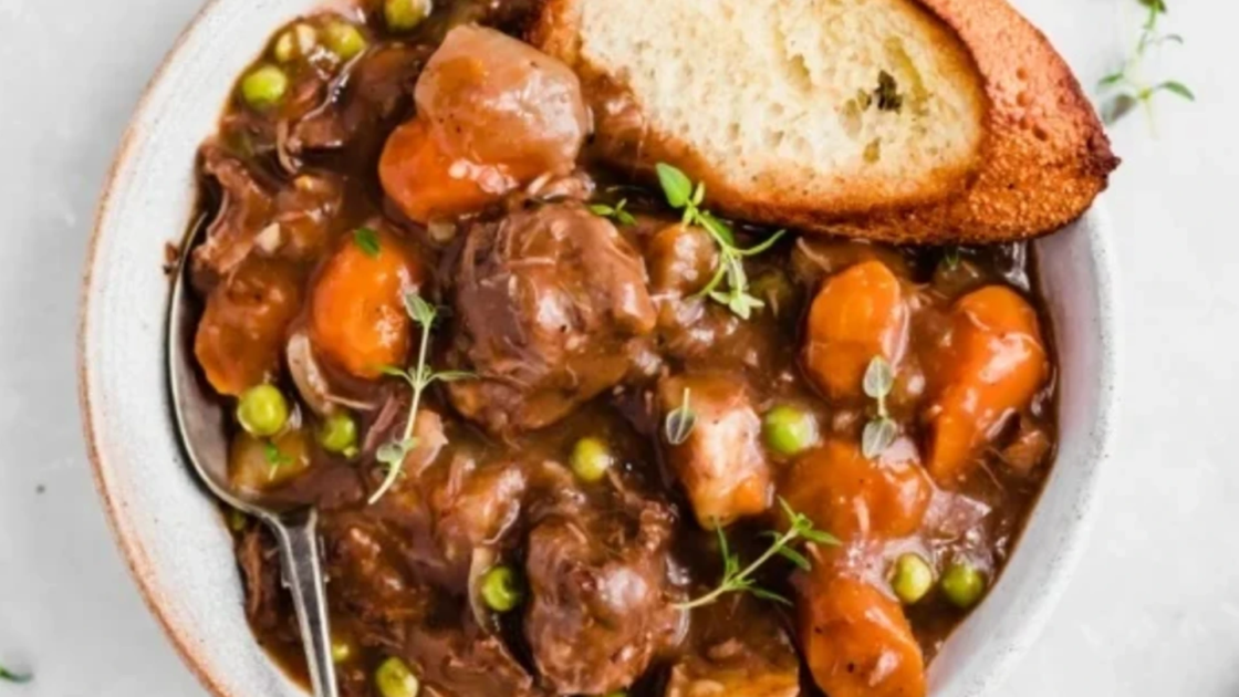 - Next, remove 1 cup of beef broth from the slow cooker and transfer to a medium bowl. Whisk in ¼ cup flour until there aren’t any lumps remaining. Add back to the slow cooker and stir to combine. Add in frozen peas and cook uncovered on HIGH for 10-15 more minutes until beef stew thickens up a bit. Serve immediately with toasted French bread, cornbread, crackers, or biscuits.